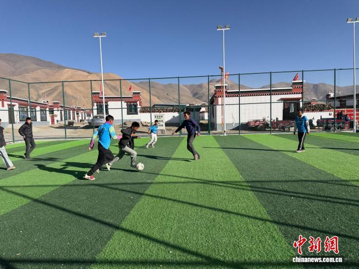 1月5日,森嘎村球场上,孩子们在踢球。中新社记者 赵朗 摄