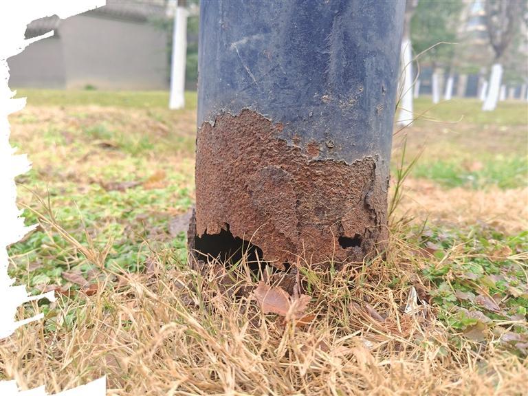 三秦都市报-三秦网讯(记者 文晨 实习生 高桦)“这个路灯的灯杆,底部都已经锈烂了,感觉撞一下就会断掉。娃在这跟前玩,还是有些危险。”最近,家住西安市长乐东苑小区的市民李先生向三秦都市报“小秦帮忙”栏目反映,他家附近的垃圾分类主题公园里有一盏路灯底部锈蚀严重,存在安全隐患,希望相关部门及时排查修复。