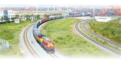 满载集装箱的班列驶离广西钦州铁路集装箱中心站。