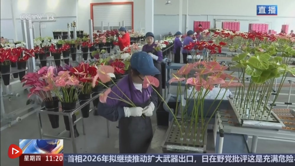 记者来到陕西省规模最大的鲜切花种植基地,这里是他们的包装车间。大家可以看到,我身后的8条生产线正在高速运转,工人们熟练地对鲜花进行分拣、包装。每一枝年宵花从采摘到成品仅需一小时,确保以更加新鲜的状态发往全国各地。车间的另一侧可以看到电商直播区也格外忙碌,主播们正通过线上平台向消费者推荐今年的年宵花系列礼盒,这种“线上线下融合保供”的模式,也是提升了工厂快速响应市场需求的能力。