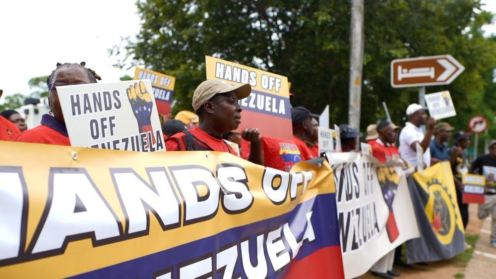 当地时间8日中午,南非民众在位于行政首都比勒陀利亚的美国驻南非大使馆前举行集会,高喊“停止干涉委内瑞拉”等口号,抗议美国对委内瑞拉实施军事打击。