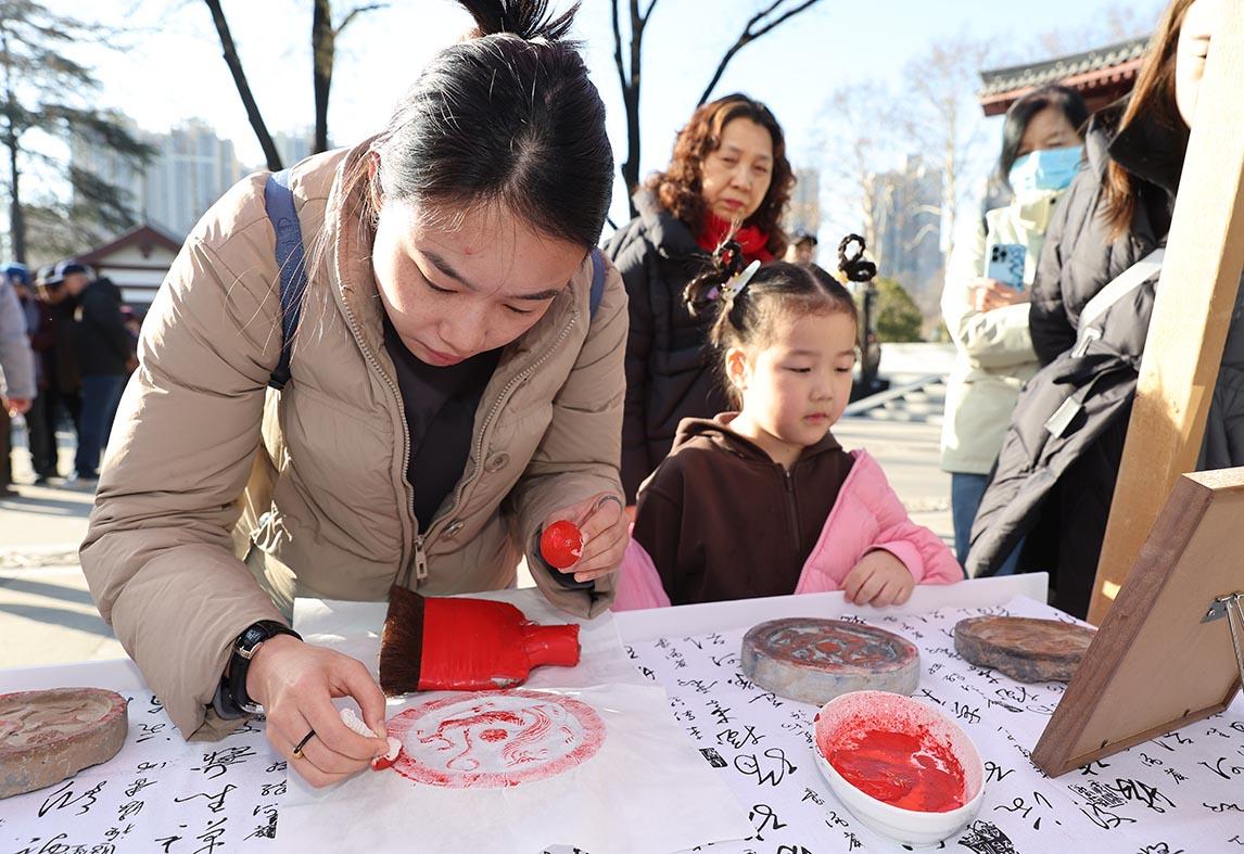 活动现场,互动体验区成了最具人气的地方。在诗词拓印区,聚集了不少亲子家庭。孩子们屏息凝神,在工作人员的指导下,手持拓包,小心翼翼地蘸墨、扑打。当宣纸上逐渐清晰地浮现出李白“云想衣裳花想容”的飘逸墨迹,或是王维“此物最相思”的端庄楷书时,孩子们脸上绽放出笑容。