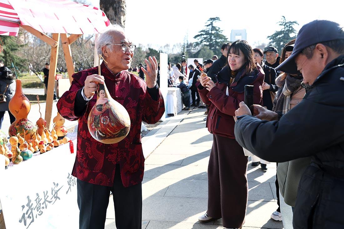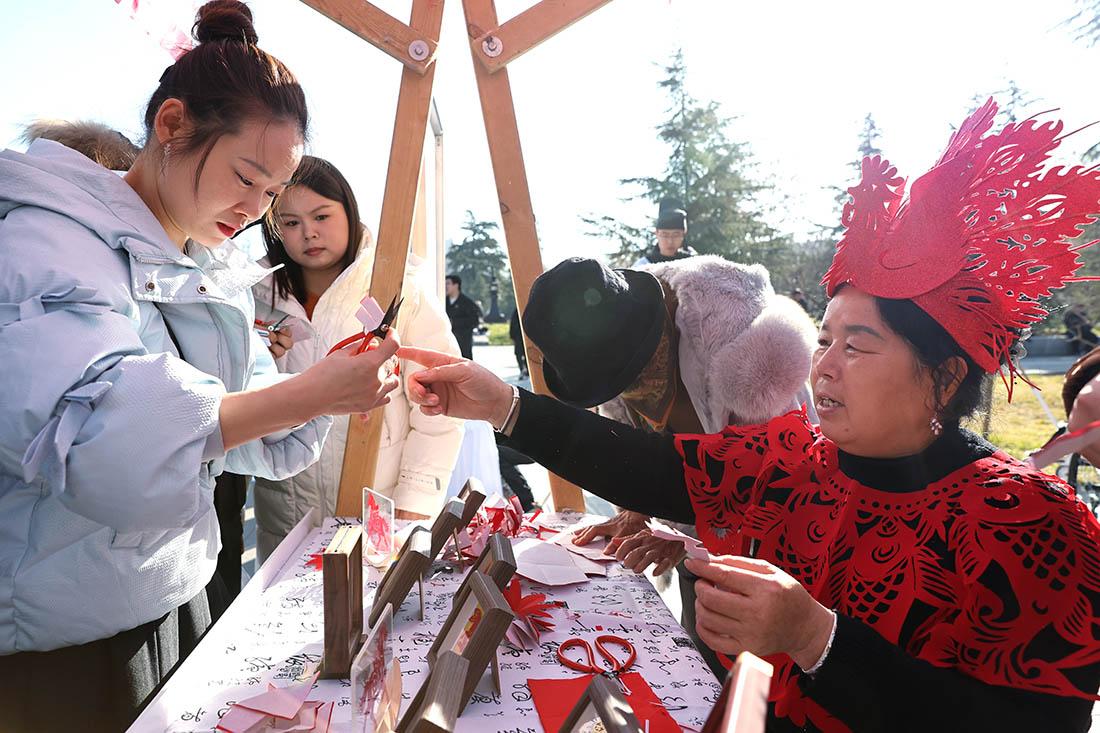 非遗体验区里,葫芦彩绘与剪纸展台前格外热闹。素净的葫芦被描上灵动纹样,红纸在剪刀开合间化作栩栩如生的花鸟人物。在这里,唐诗不仅是文字,更是一种可闻、可触、可创造的生活方式。