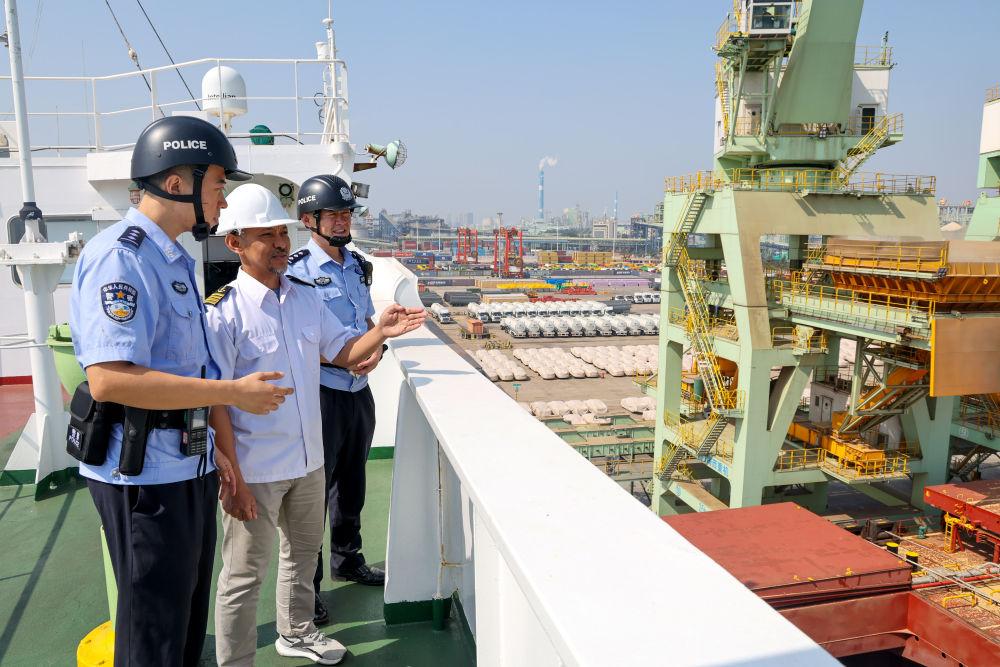 2025年10月1日,在山东港口日照港,日照出入境边防检查站民警登上外轮与外籍船长(中)交流。新华社记者 郭绪雷 摄