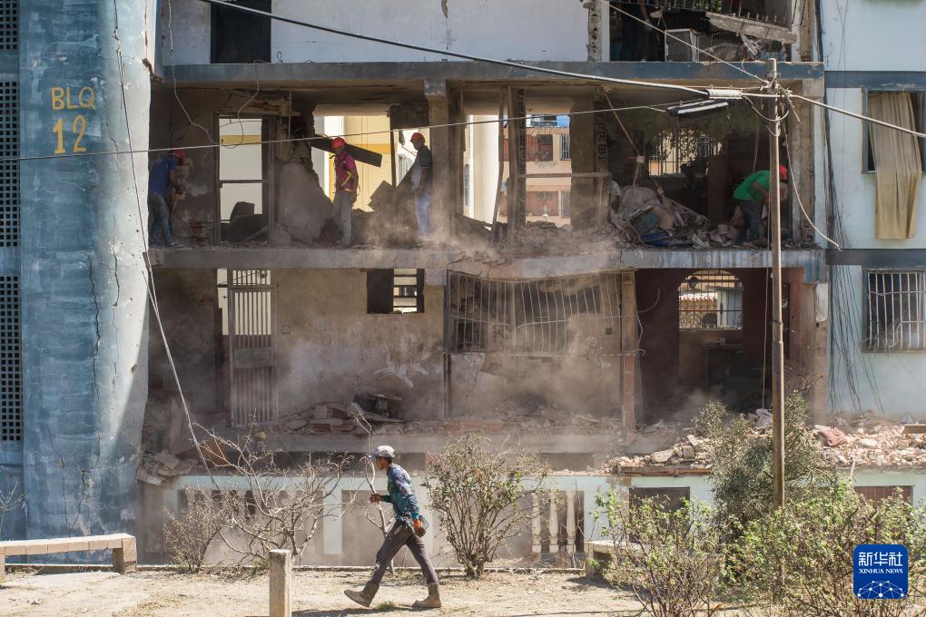 1月5日,在委内瑞拉拉瓜伊拉州卡蒂亚拉马尔市,工作人员在被美国空袭损毁的建筑内进行修缮。