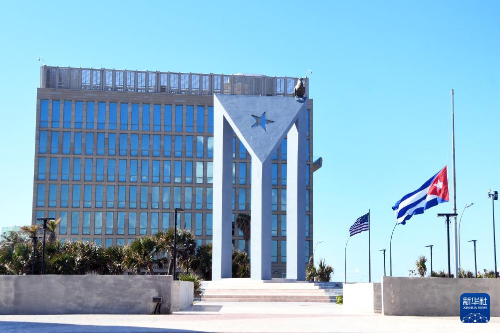 1月5日,在古巴首都哈瓦那,美国驻古巴大使馆前的古巴国旗降至旗杆中间。