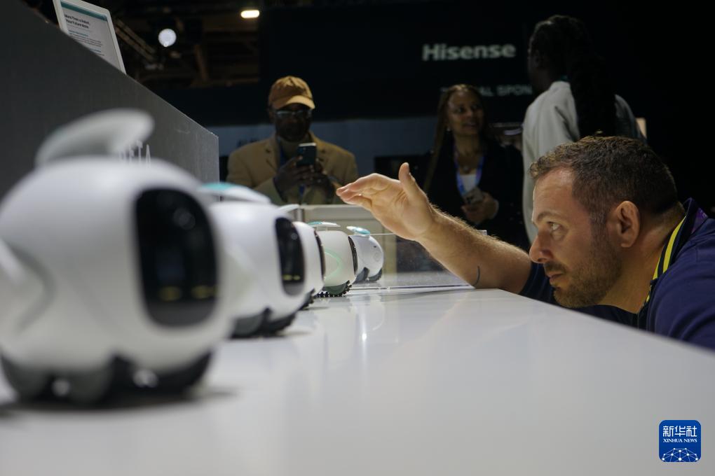 1月7日,一名男子在2026年美国拉斯维加斯消费电子展(CES)海信展台观看搭载新一代AI智能识别引擎的陪伴机器人Beta。
