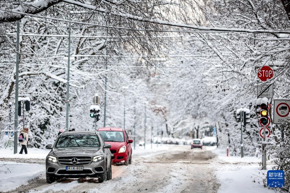 1月7日,在匈牙利布达佩斯,汽车在雪中行驶。