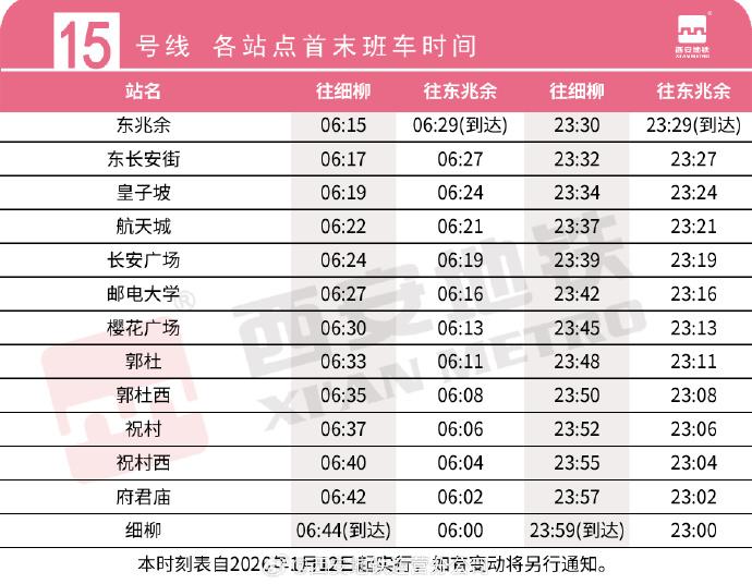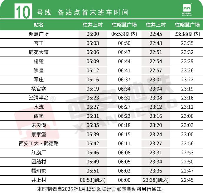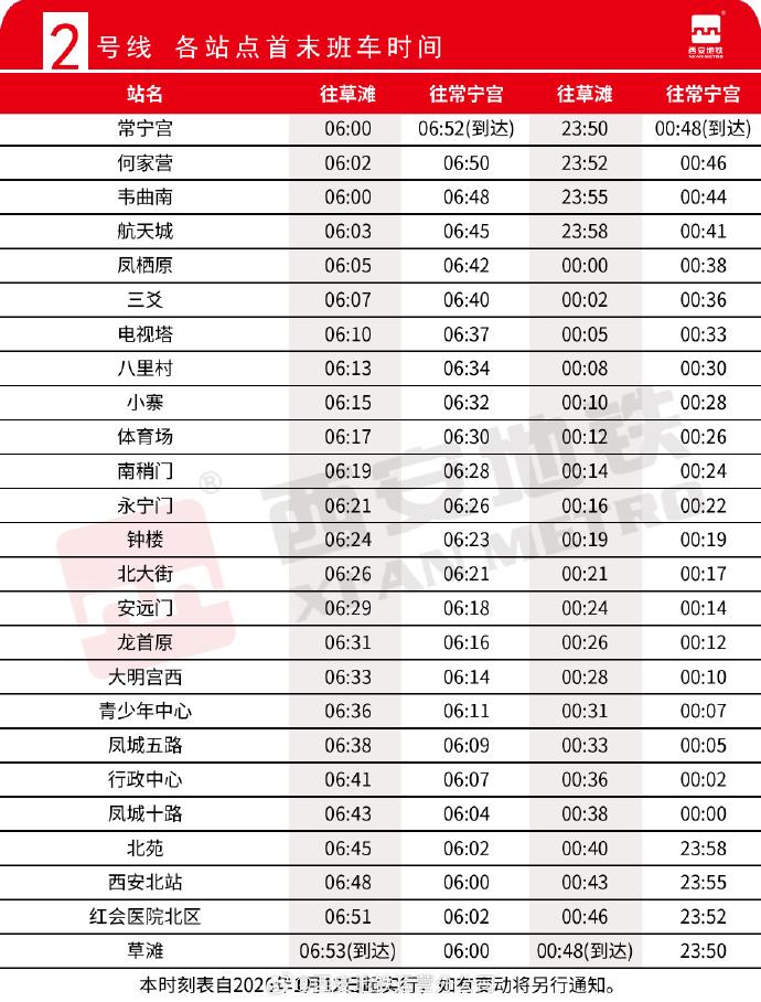 三秦都市报-三秦网讯(记者 张彦刚)记者1月11日从西安市轨道交通集团获悉:结合近期线网客流变化,为进一步满足市民乘客出行需求,西安地铁将于2026年1月12日(周一)起,对2、10、15 号线末班车时间进行调整。其中,2号线草滩站、常宁宫站末班车发车时间延长至 23:50;10号线昭慧广场站、井上村站末班车发车时间延长至 22:45;15号线东兆余站末班车发车时间延长至 23:30、细柳站末班车发车时间延长至 23:00。其余线路末班车发车时间保持不变。