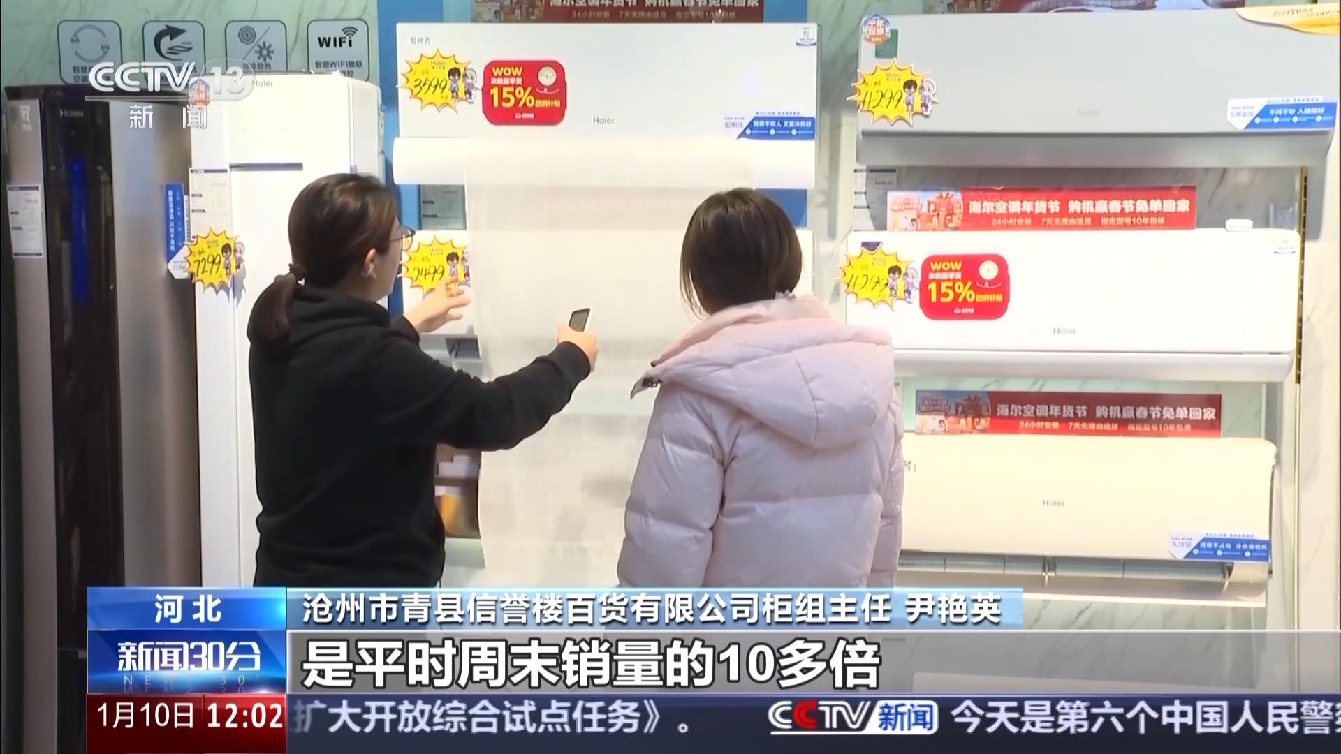沧州市青县信誉楼百货有限公司柜组主任 尹艳英:空调、冰箱这些刚需品类卖得最好。元旦当天,空调、电视、冰箱就卖了600多台,是平时周末销量的10多倍。