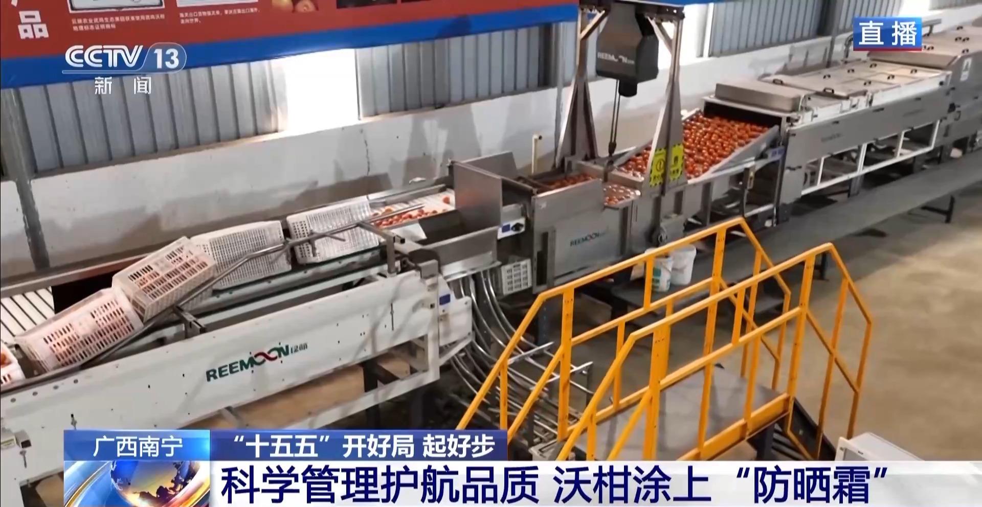 从枝头摘下,沃柑的旅程可以说才刚刚开始。在园区的智慧分拣中心,新鲜沃柑首先需要集体“洗个澡”,洗去表面的灰尘杂质,也包括之前残留的石灰。清洗干净随后进行烘干处理。紧接着,它们将会迎来一场“全身体检”,沃柑们依次通过分选机,在这里,每一个沃柑都会单独“拍照”,系统能在瞬间判断出它的大小、色泽和表面瑕疵。而第二道分选机就相当于做更详细的检查,像是给沃柑做“B超”,在不损伤果肉的情况下,精准分析每一颗果实的糖度、酸度等状况。根据预设的分级标准,将沃柑自动分配到不同的出口。这里的全自动分选线,每小时能处理超过12000斤沃柑,极大地提高了分拣效率。