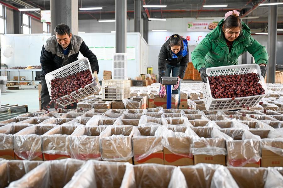 MOYU, Jan. 10 (Xinhua) -- Premium Xinjiang goods like walnuts and red jujubes, which are popular choices for customers nationwide for the Chinese New Year, have entered their peak sales season as the Spring Festival approaches. E-commerce companies in Hotan are leveraging live-streaming sales and online shopping festivals to promote high-quality agricultural products of Xinjiang, boosting farmers' incomes and rural revitalization.