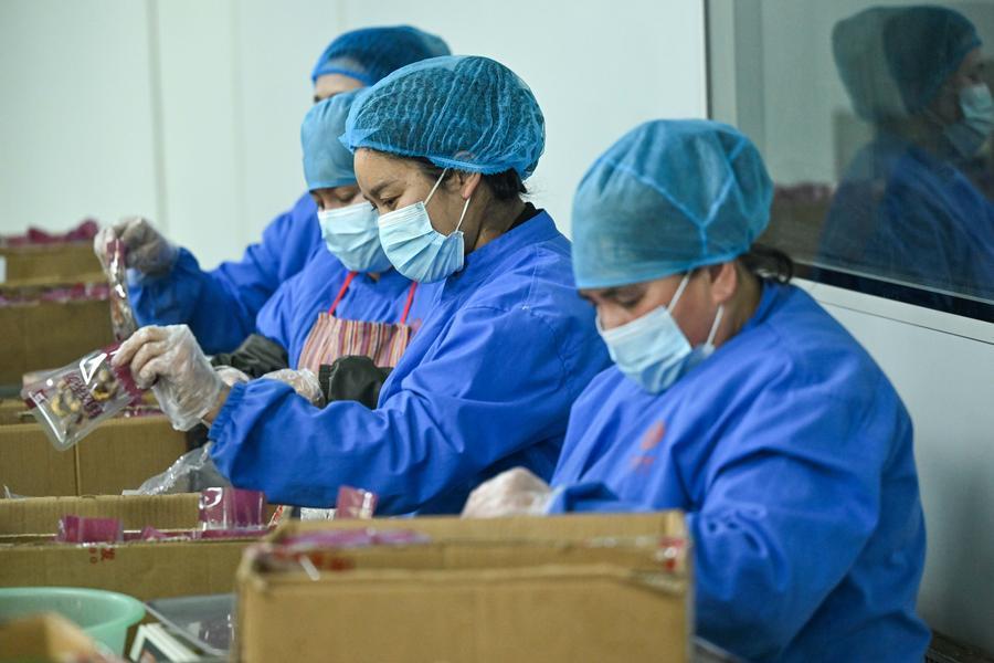 Employees pack nuts at a food company in Moyu County, Hotan Prefecture, northwest China's Xinjiang Uygur Autonomous Region, Jan. 9, 2026. (Xinhua/Ding Lei)