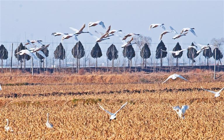 1月10日,大荔县赵渡镇的农田迎来成群结队的国家二级保护动物白天鹅。大荔县湿地保护中心工作人员介绍,随着当地生态环境持续向好,近年来,来此越冬的白天鹅数量逐年增加。通讯员 李世居摄