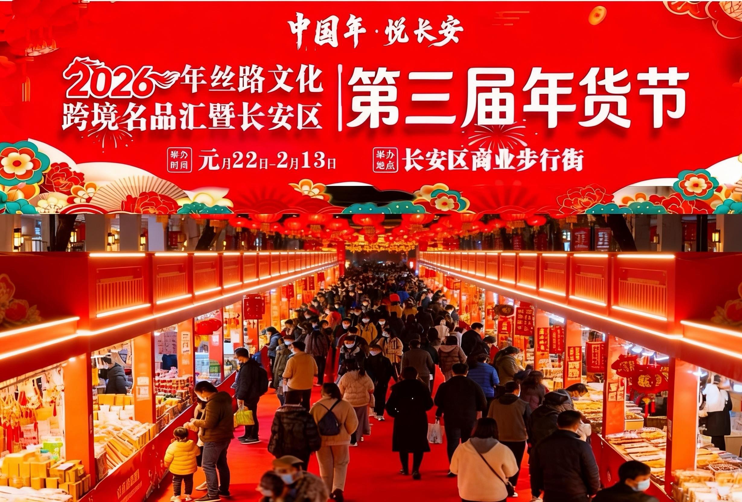 “中国年·悦长安”“中国年·悦镇安”2026丝路文化跨境名品汇暨长安区第三届年货节将于2026年元月22日-2026年2月13日在长安区步行街,2026年2月1日-2026年2月13日在镇安中心广场、步行街启动。在春节来临之际,为市民提供一站式便捷服务。