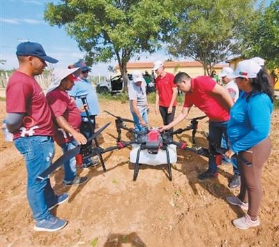 在巴西北里奥格兰德州联邦教育科技学院阿波迪校区农场,巴西师生和农户学习操作中国生产的无人机。
