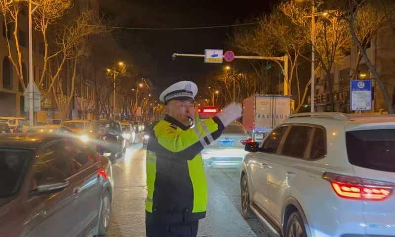 晚自习结束后,执勤交警继续坚守岗位,指挥疏导交通,保障学生平安离校。夜间,大队开启“无声护送”模式,安排警车亮灯在学校周边巡逻,随时应对突发情况,用警灯照亮学子回家路。