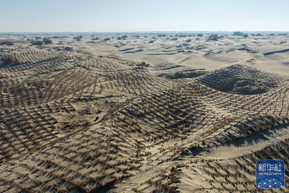 ↑ 这是在新疆和田地区墨玉县喀瓦克乡周边沙漠拍摄的草方格(1月11日摄,无人机照片)。