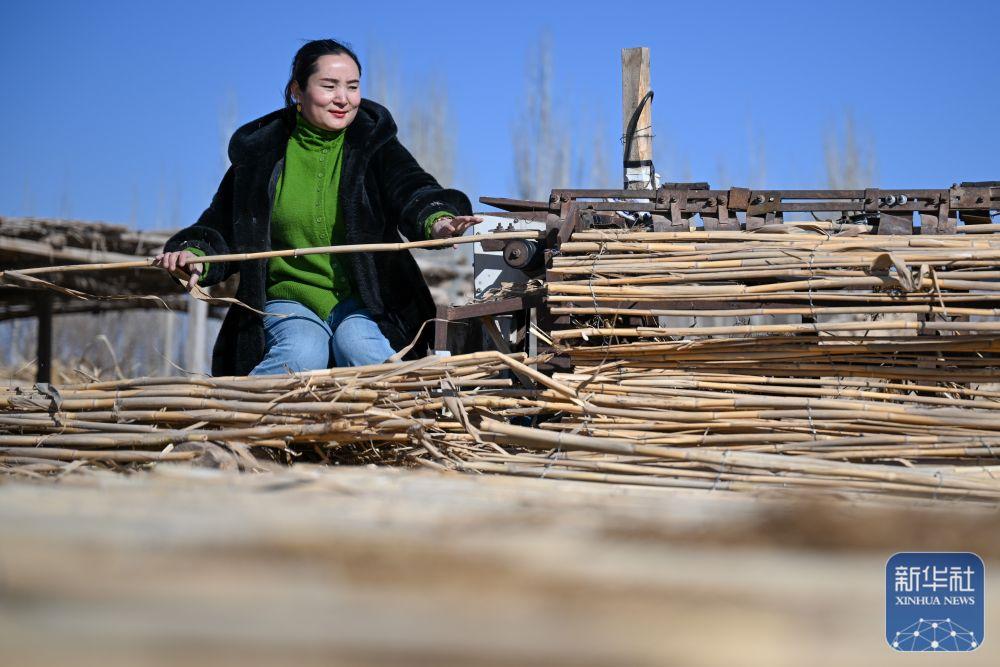 ↑ 在新疆和田地区墨玉县碧玉农产品农民专业合作社,农户将收割的芦苇压制成捆(1月10日摄)。
