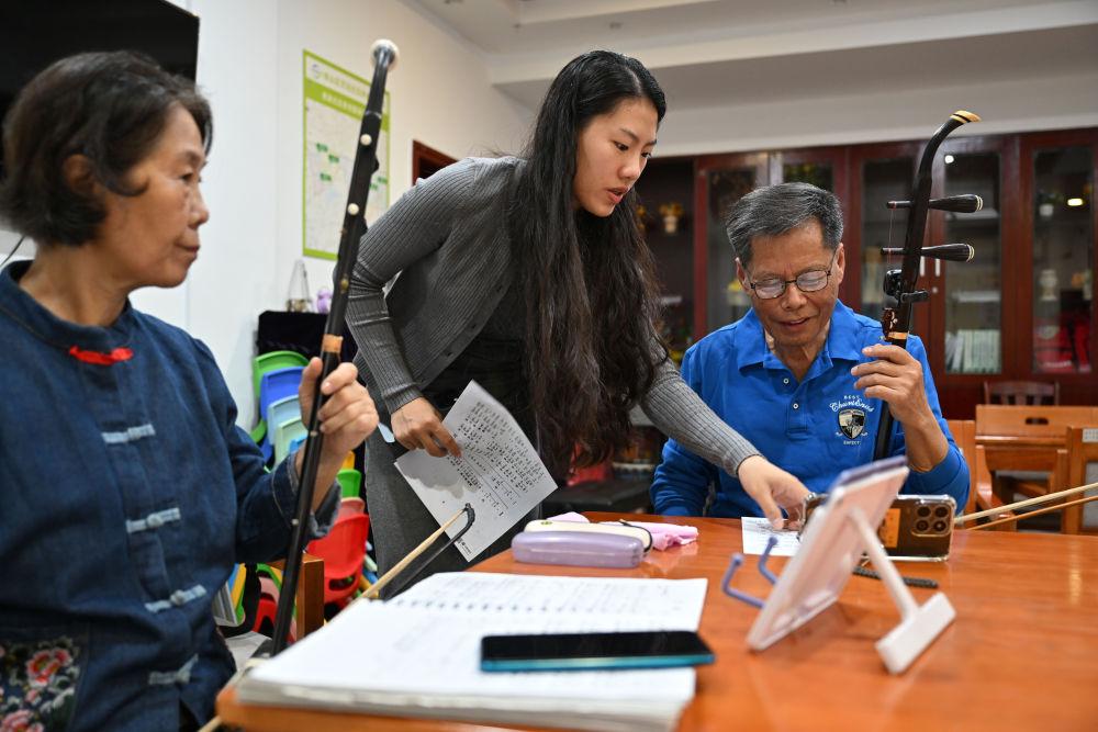 10月28日,在海口市琼山区文坛社区养老服务站,老年人在学习拉二胡。新华社记者 郭程 摄