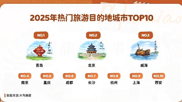 《报告》显示,2025年最受欢迎的10个民宿消费目的地依次为:青岛、北京、威海、南京、重庆、成都、长沙、杭州、上海、西安。受苏超带动,南京成为木鸟民宿今年搜索和咨询量最高的城市,徐州全年民宿订单同比增长122%。其中,TOP100热门目的地中,开封、防城港、乌鲁木齐、清远、贵阳、连云港、徐州、日照、陵水、柳州成为增速最快的十大目的地,开封全年订单增速达4.6倍。