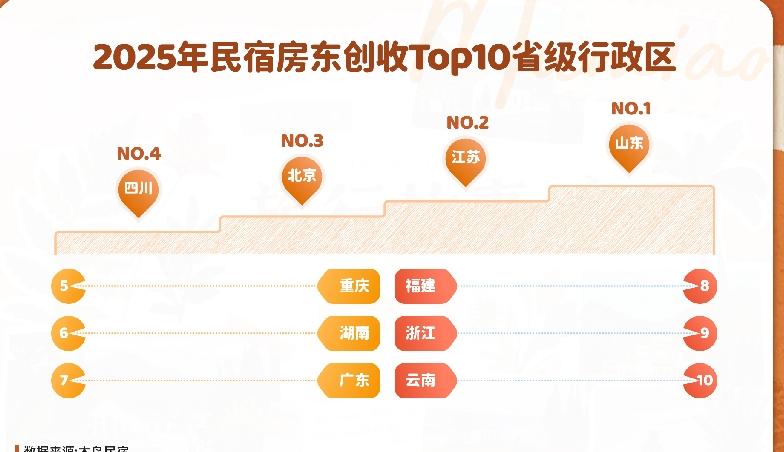 2025年民宿房东创收Top10省级行政区分别为:山东、江苏、北京、四川、重庆、湖南、广东、福建、浙江、云南。新疆、贵州、河南成为2025年订单增速最快省份。