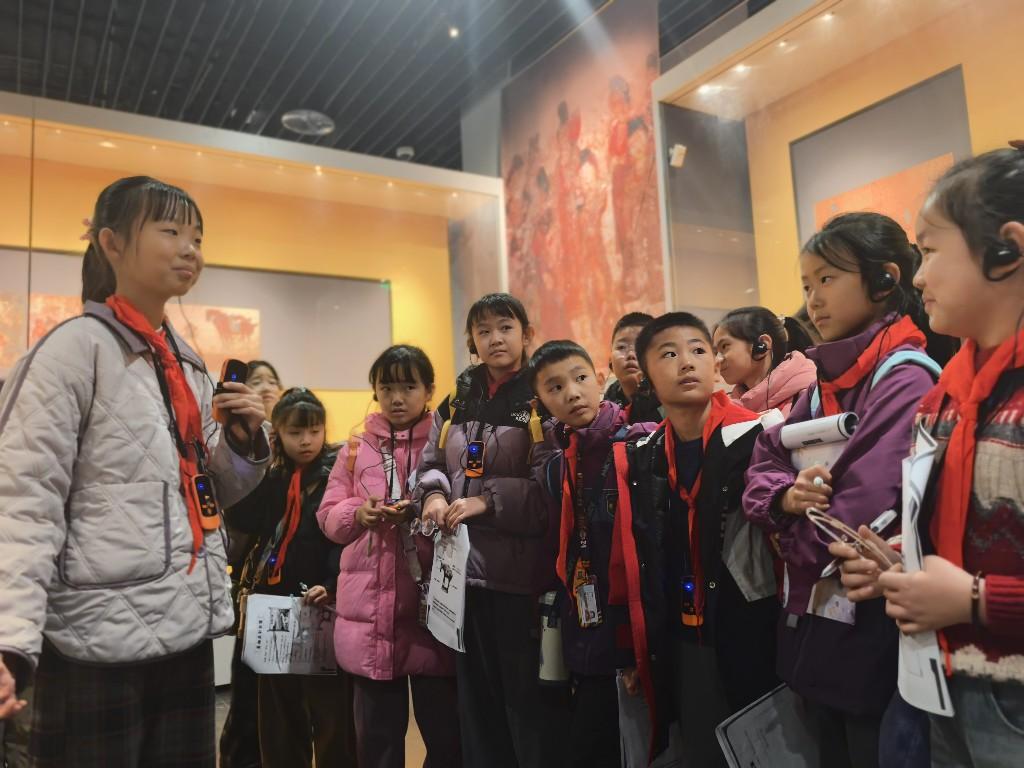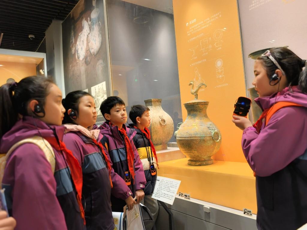 课程现场,少先队员们化身“红领巾讲解员”,提前与家长共同梳理史料、精心打磨讲稿。在博物院内,他们以“文物故事+现场互动”的创新形式,向同伴与家长生动讲述了唐三彩的釉料配方、唐代铜镜的吉祥纹饰,以及长安坊市的繁华景象和丝路商队的往来故事。这种从文物工艺到时代风貌的全方位解读,让冰冷的展品瞬间变得鲜活可触,文化学习也从“课堂聆听”转变为“主动输出”。