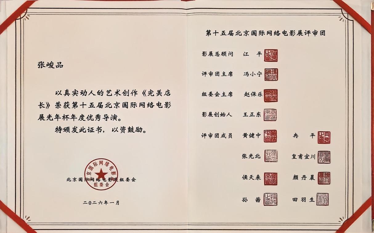 三秦都市报-三秦网讯(记者 王娇莉)近日,第十五届北京国际网络电影展荣誉盛典在北京落幕,记者获悉,陕西籍导演、音乐制作人张峻品凭借其执导的电影作品《完美店长》脱颖而出,荣获“优秀导演奖”,展现了陕西文艺创作者在全国影视平台上的实力与风采。