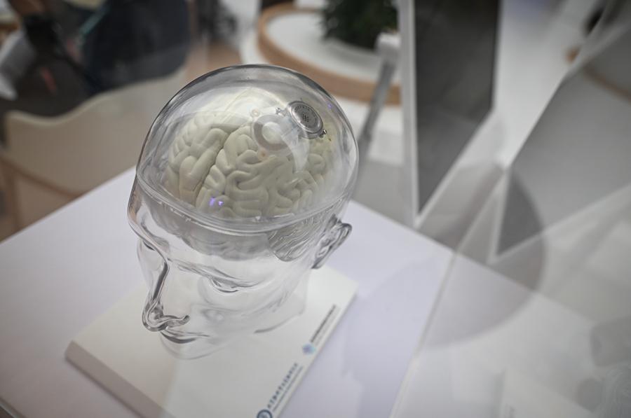 在2025中关村论坛年会上展示的“北脑一号”智能脑机系统模型。新华社记者 陈钟昊 摄