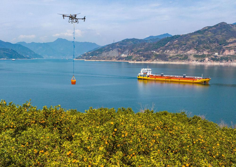 2025年3月17日,湖北省秭归县郭家坝镇邓家坡村村民用无人机转运脐橙(无人机照片)。新华社发(郑家裕摄)