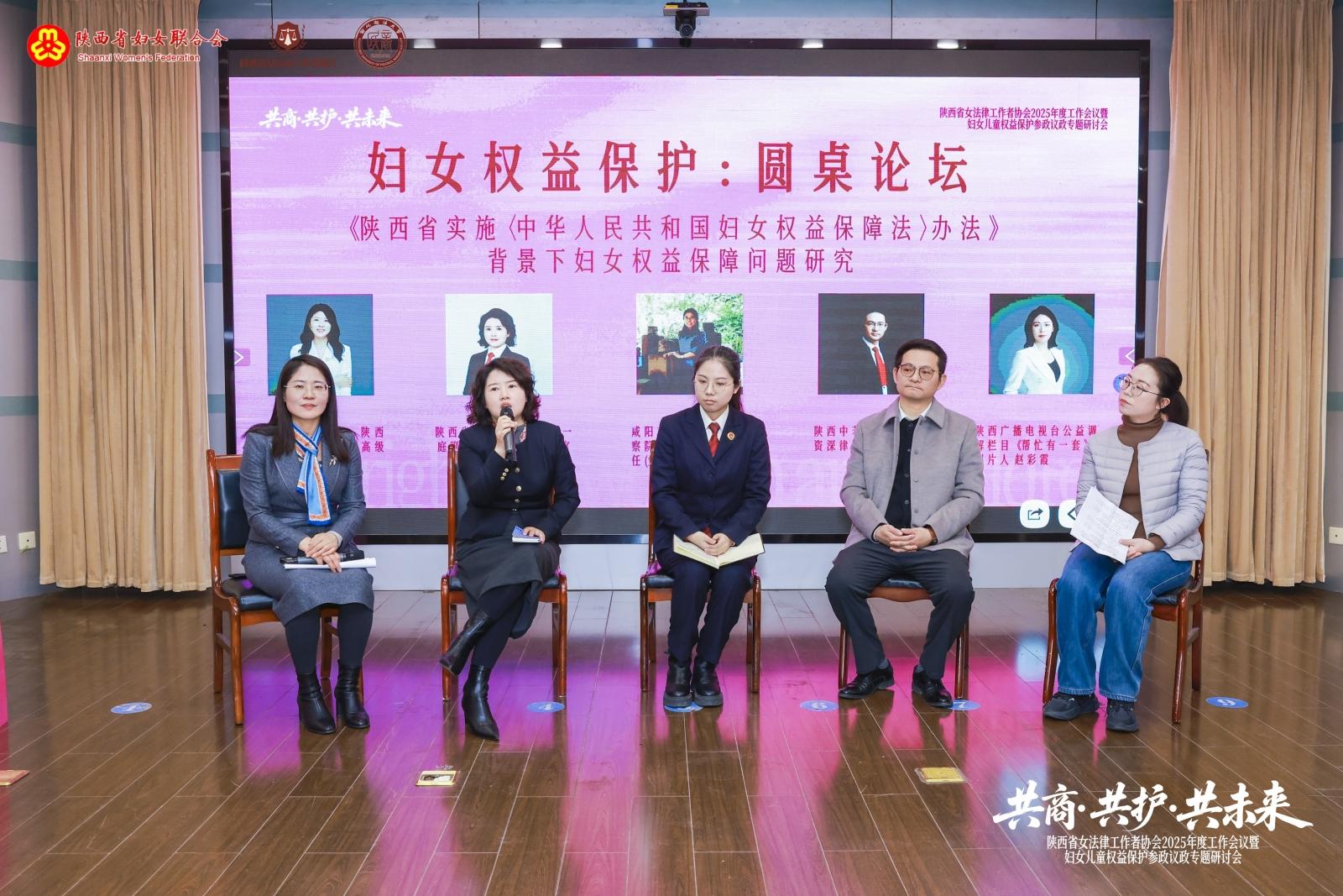 主旨演讲结束后,进入圆桌论坛环节。陕西省高级人民法院民一庭副庭长、四级高级法官、省女法协副会长滕欣燕,咸阳市渭城区人民检察院第四检察部副主任(负责人)赵培,陕西中若律师事务所资深律师潘金辉,以及陕西广播电视台公益调解栏目《帮忙有一套》制片人赵彩霞,聚焦妇女儿童权益保护实践中的重点难点问题,展开互动交流与深度探讨。