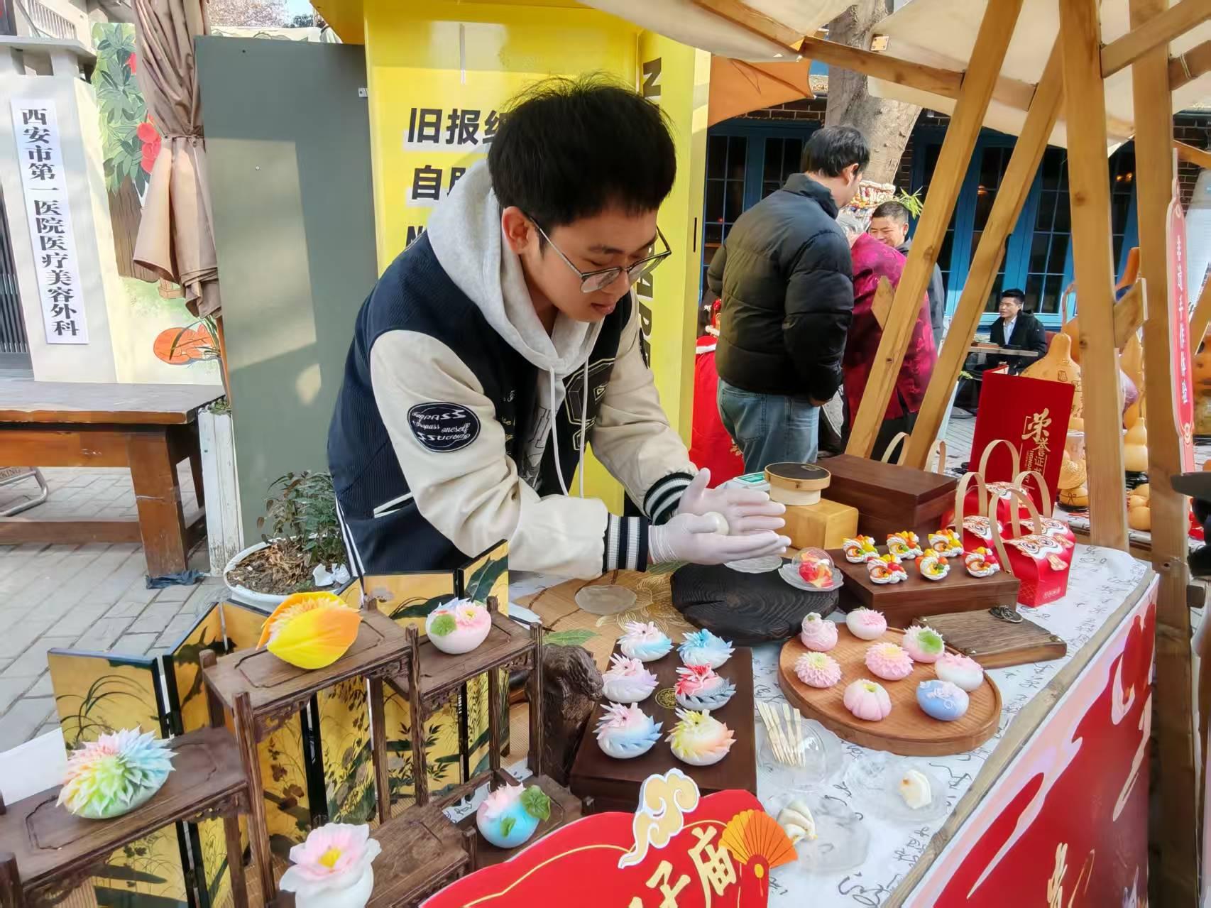 “指尖非遗·德福同行”非遗市集同样人气爆棚。7个非遗手作摊位沿街区分散排布,唐果子、花饽饽、碑林彩塑、关中葫芦、嵌扣香囊、乌金拓、传统结绳等特色项目,以唐诗为灵感,让传统文化在指尖流转。非遗代表性传承人手把手教学,游客和亲子家庭沉浸式学习体验传统技艺的魅力。捏制“桃之夭夭”主题唐果子,在软糯口感中品味唐风雅韵;勾勒唐诗意境彩塑,在色彩与线条中培育工匠精神;雕刻“福禄”葫芦,将诗词名句绘于器身;缝制嵌扣香囊,把艾草清香与亲情祝福藏于锦袋,复刻唐诗中的雅致情愫。