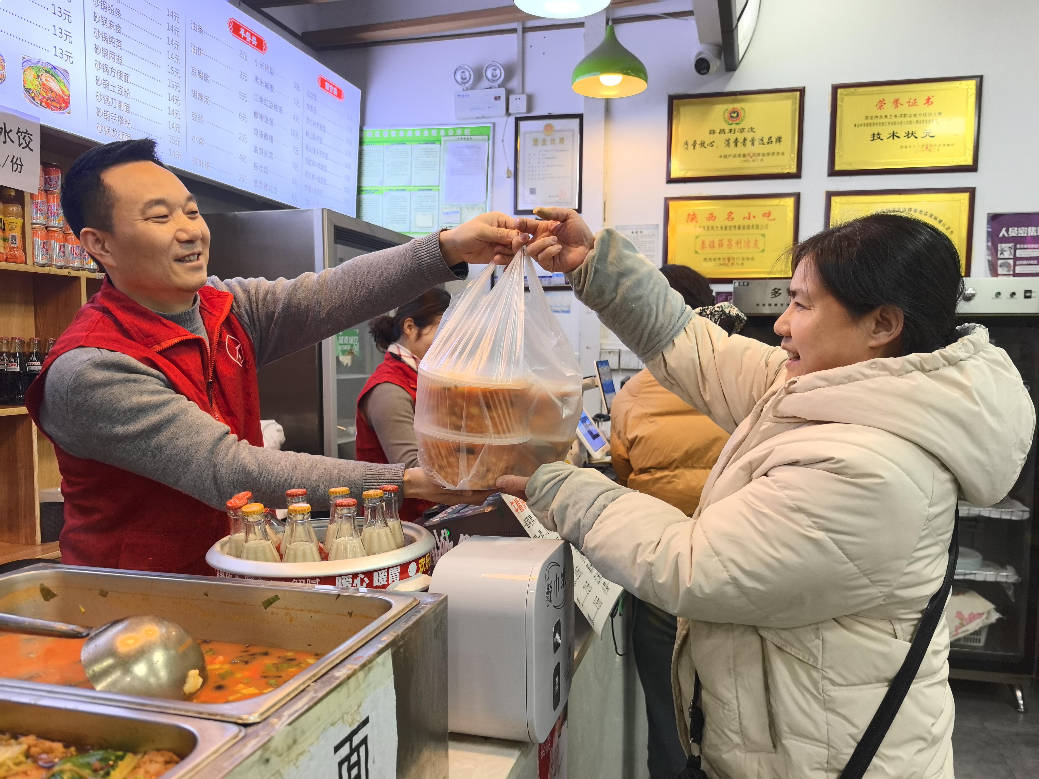 在薛昌利大米凉皮店,看到志愿者来取餐,负责人任师傅放下手中的活计,笑着说:“爱心餐,我们会一直坚持做下去!”