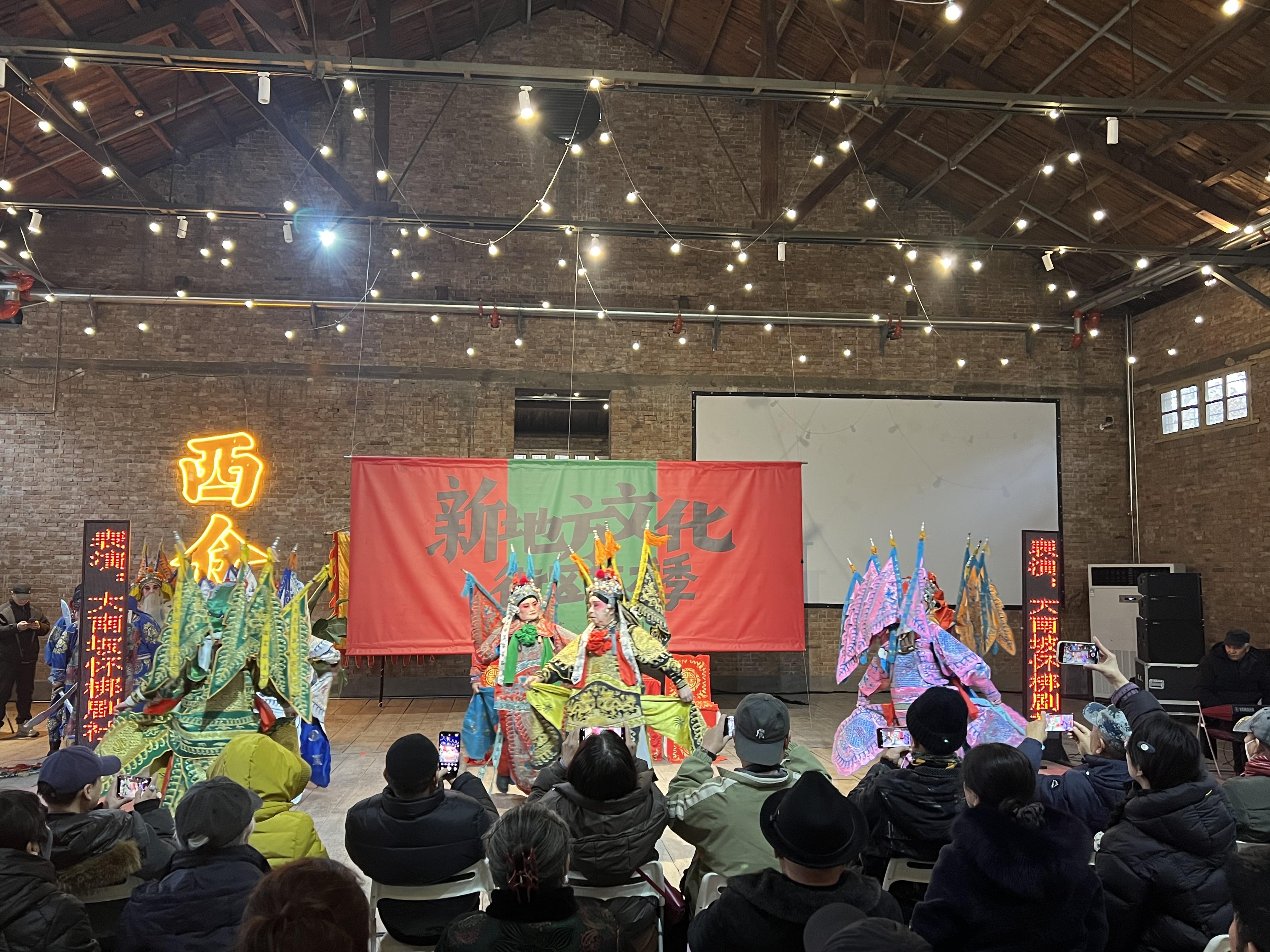 三秦都市报-三秦网讯(记者 艾莉)1月18日,“新地方文化·街区艺术季”新年系列活动持续呈现,在西仓市集文创公园上演了一场“戏曲碰摇滚、传统撞潮流”的大戏,来自河南大南坡怀梆剧社的20多位艺人把属于土地、属于村庄、属于村民的声音,带到了新的观众面前;同时,蛋壳乐队也以他们独特和真实的音乐,让现场观众大呼“周末有戏,非常过瘾”。