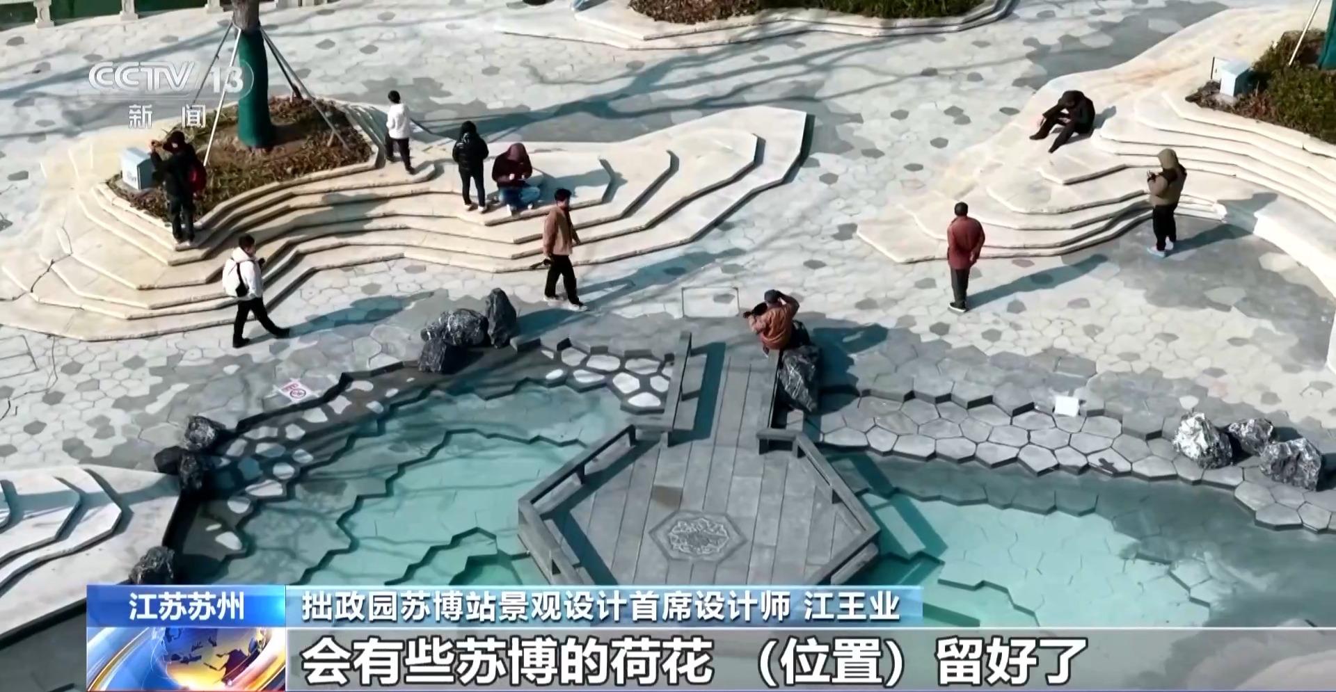 拙政园苏博站景观设计首席设计师 江王业:苏博在设计的时候用了很多三角、框形,尤其在建筑中用一些白描的手法,所以本身它也是一个抽象的园林。包括苏博内部有水系,但是大家一般要走到苏博,排上很长的队,才能看到。所以我们当时就想,一方面希望所有人从地铁出来或经过街边,它都可以很好地把苏博的空间面展示出来。