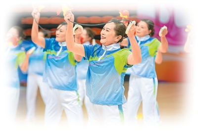 在江苏省海安市体育中心举行的老年人体育健身嘉年华活动上,老年人在展示健身球操。