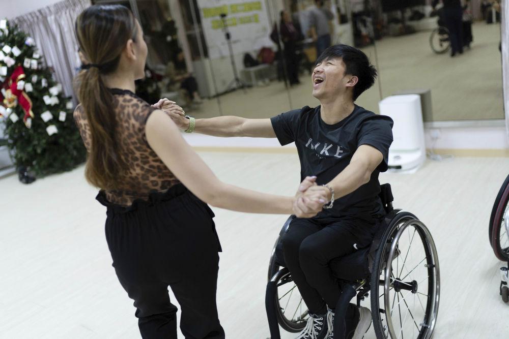 1月14日,轮椅舞蹈运动员余俊延(右)与舞伴一起练习 。新华社发(吕小炜 摄)