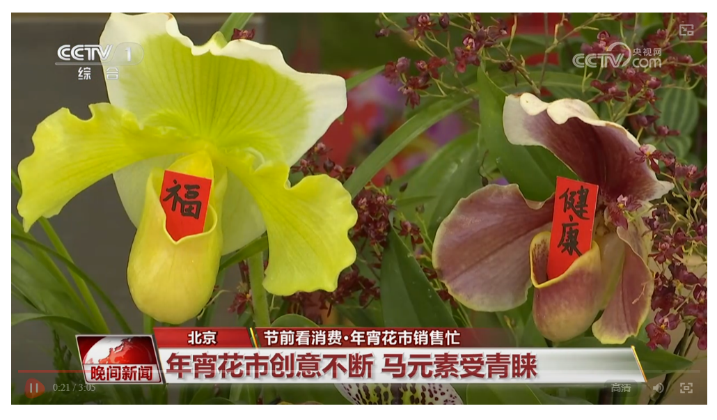 在北京花卉交易中心,各色年宵花争奇斗艳。其中,新品兰花“兜兰”十分惹眼,独特的兜形花瓣里,被放入“顺遂”“健康”的祝福卡片,寓意“兜住顺遂”“兜住健康”,祝福满满,年味十足。