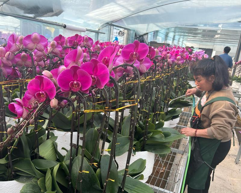 “我们培育了30多个优质品种,眼下正是盛花期,每天能卖200多盆,临近春节还会翻倍!”基地负责人韩军锋一边察看花卉长势一边介绍。他指着身旁一盆格外抢眼的蝴蝶兰说道:“这是‘大财主’品种,花形饱满、寓意富贵,现在只剩三盆了,每盆售价在280元到300元,特别抢手。”除了“大财主”,“粉冠军”“恭喜发财”“藏宝图”等品种也很受欢迎。“前几天刚发了三车货运往四川,不少热门品种已被预订一空。”韩军锋补充道。