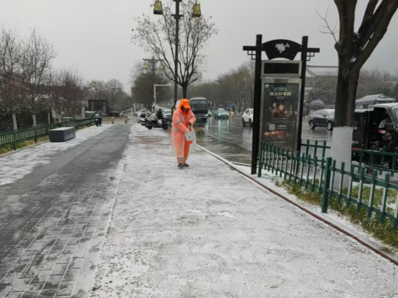降雪后,该局立即启动应急预案,对临潼城区道路、桥梁坡道等易结冰重点路段,采取“机械为主、人力辅助”精准化清雪策略:组织保洁人员对城区主次干道、人行道等区域撒布环保型融雪剂,加速积雪消融;在公厕等公共场所铺设防滑垫、设置警示标识,消除安全隐患;针对秦唐大道、秦汉大道、凤凰大道等主干道及重点旅游线路,出动专用作业车辆开展融雪剂撒布作业,全力保障交通动脉畅通。