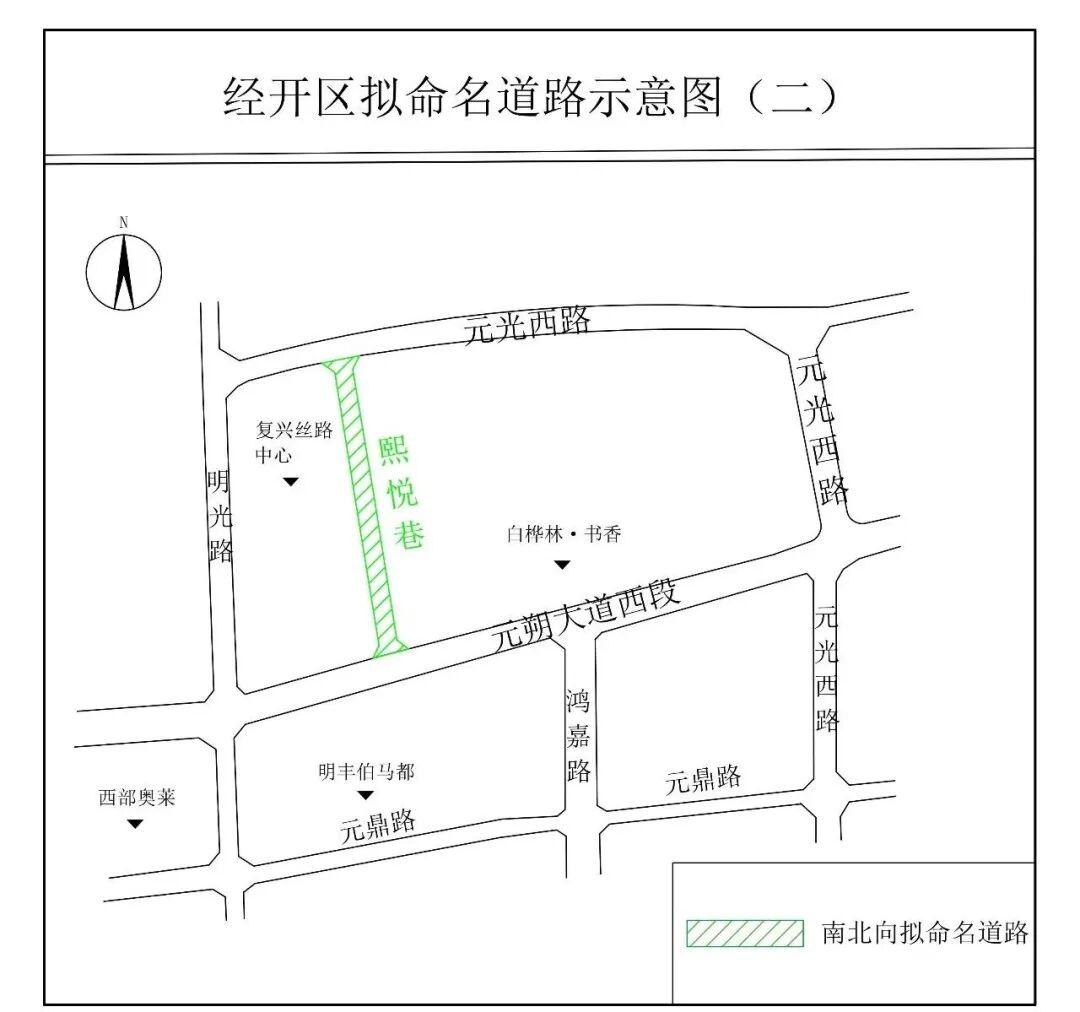 (五)熙悦巷(Xīyuè Xiàng):该路南起元朔大道西段,北至元光西路,位于复兴丝路中心东侧,长360米,宽20米。