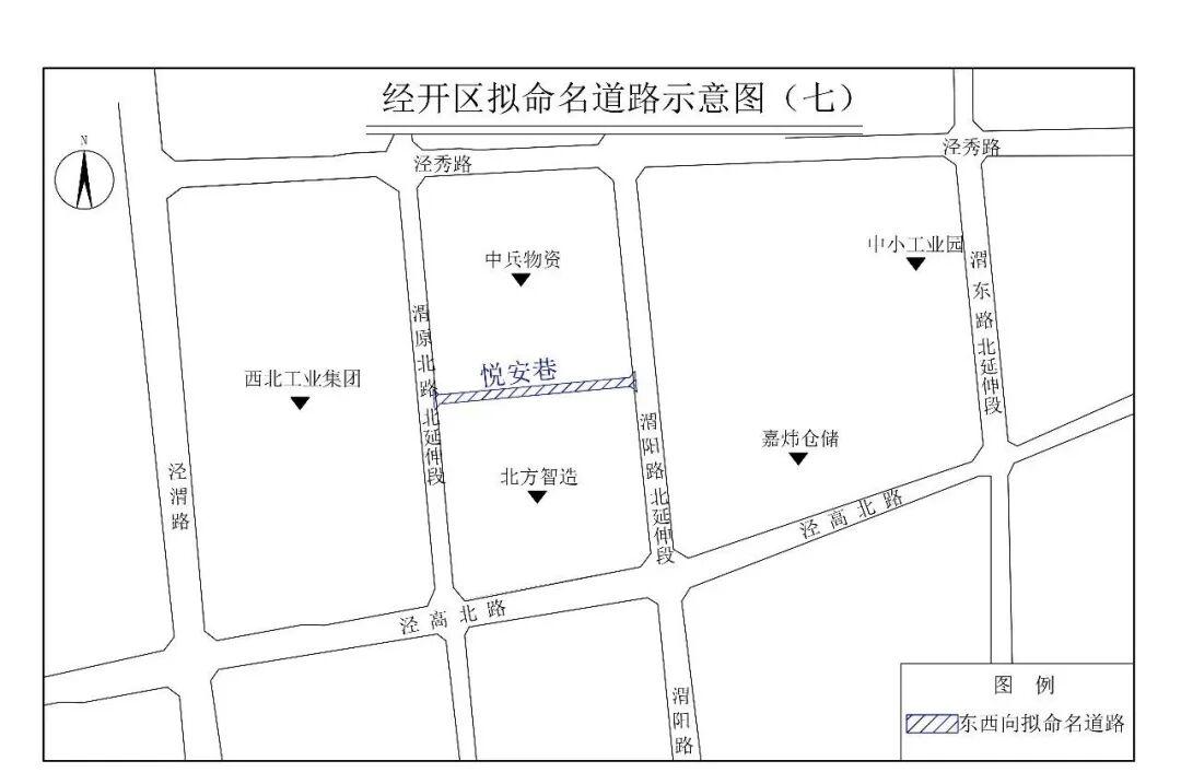(十)悦安巷(Yuè’ān Xiàng):该路东起渭阳路北延伸段,西至渭原北路北延伸段,位于中兵物资与北方智造两公司之间,长440米,宽20米。