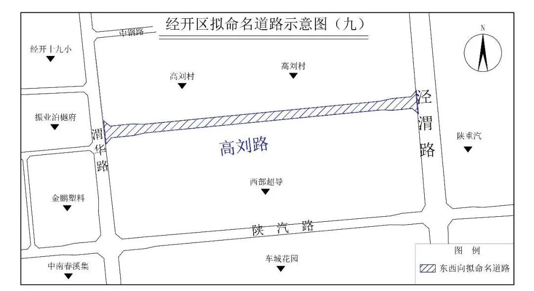 (十二)高刘路(Gāoliú Lù):该路东起泾渭路,西至渭华路,位于原高刘村南侧,长1200米,宽30米。