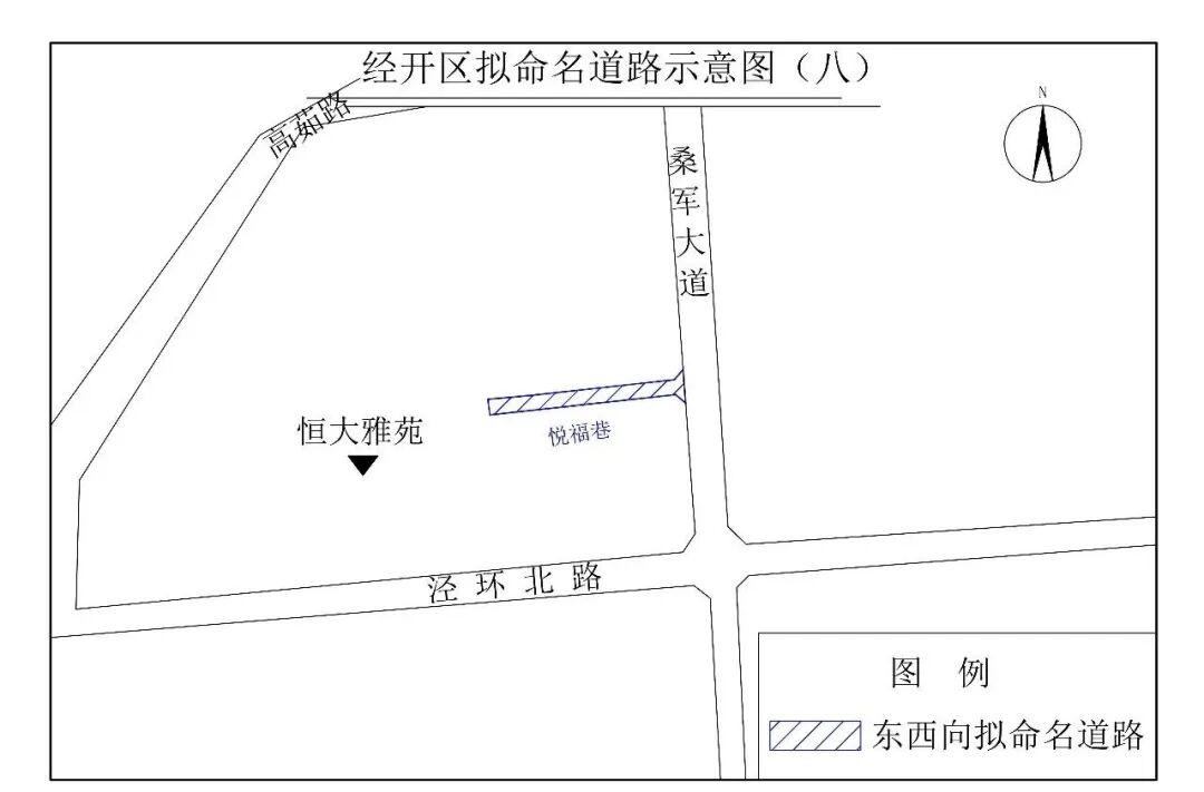 (十一)悦福巷(Yuèfú Xiàng):该路东起桑军大道,向西尚未完全贯通,道路整体位于恒大雅苑小区东侧,现状长300米,宽20米。