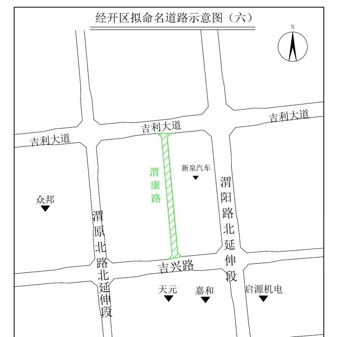 (九)渭康路(Wèikāng Lù):该路南起吉兴路,北至吉利大道,位于西安新泉汽车饰件有限公司以西,长500米,宽20米。