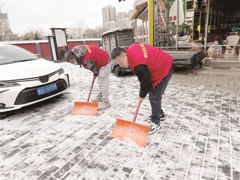 党员先锋队清理主干道,商户主动清扫门前雪,物业与志愿者逐楼栋清除单元楼门口的冰凌,为老人筑起“暖心通道”。截至当日9时,7条道路完成清理。