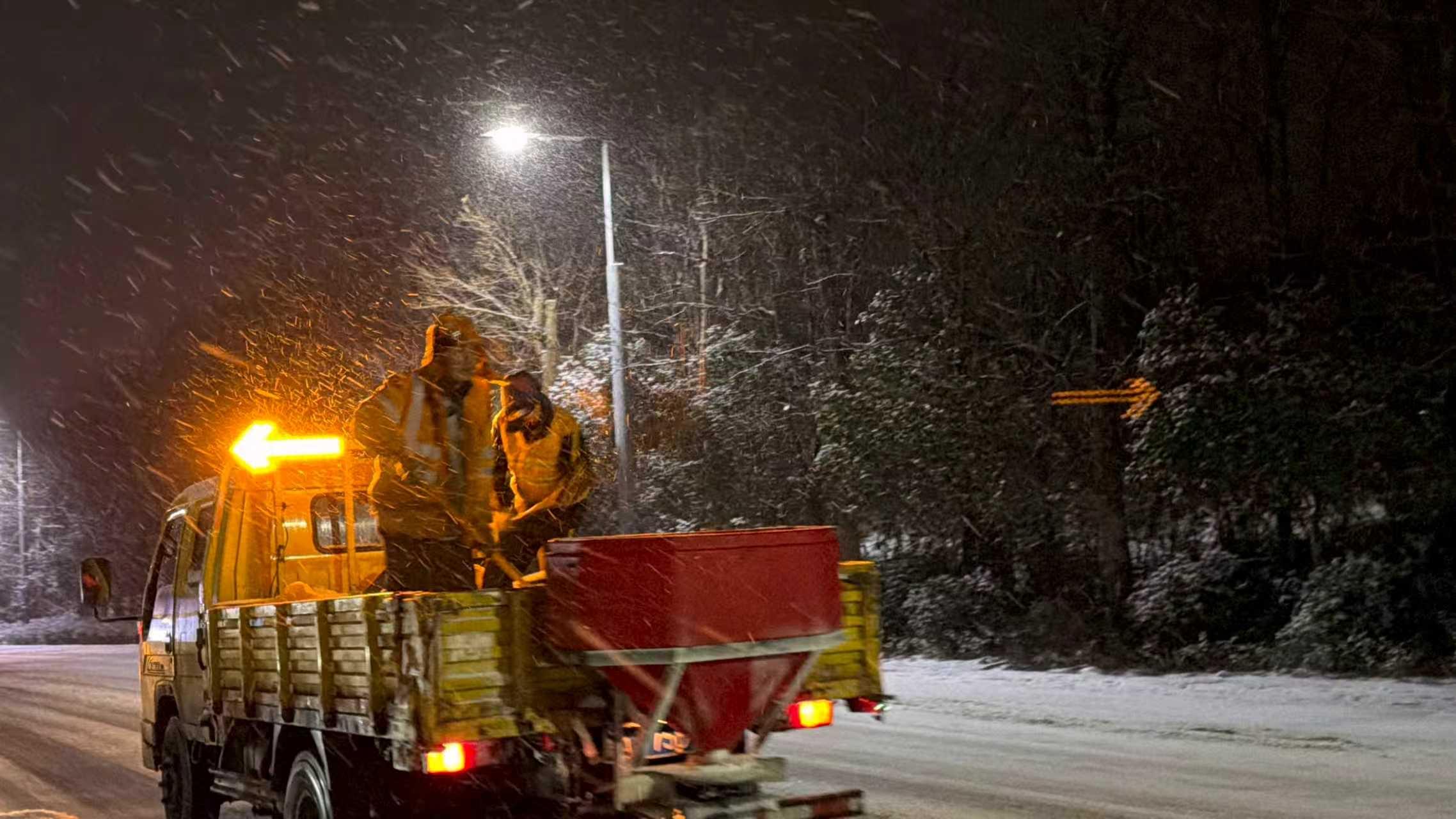 深夜12点,最后一袋融雪剂终于撒完。为防止夜间道路结冰,王欢和同事们决定赶在市民游客出行早高峰前完成第二轮除雪作业。