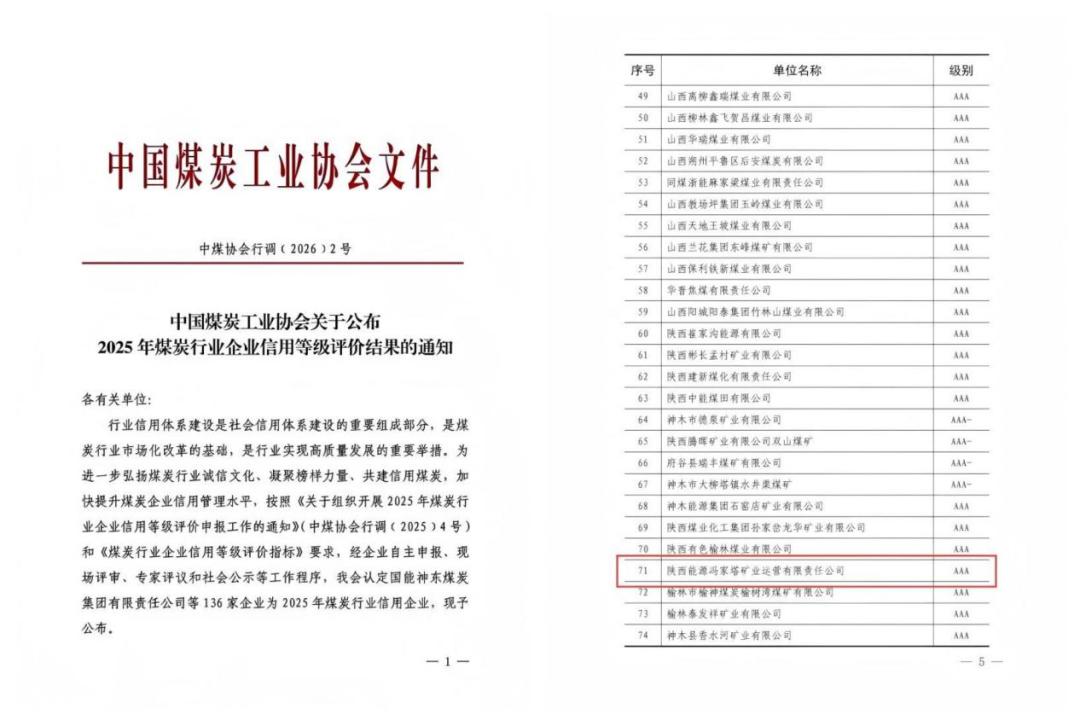三秦都市报-三秦网讯(丁亚东)近日,中国煤炭工业协会公布2025年煤炭行业企业信用等级评价结果,冯家塔矿业公司凭借规范经营、坚实合规根基与突出社会责任,顺利通过严格评审,荣获3A级信用企业称号,这是行业对公司高质量发展及信用体系建设的高度肯定。