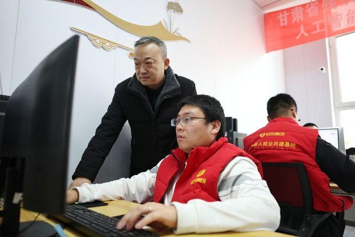 在兰州市心连心社会工作服务中心残疾人就业工坊,社会工作者王生番(左)指导残疾人AI训练师进行数据标注工作(2026年1月14日摄)。新华社记者 陈斌 摄