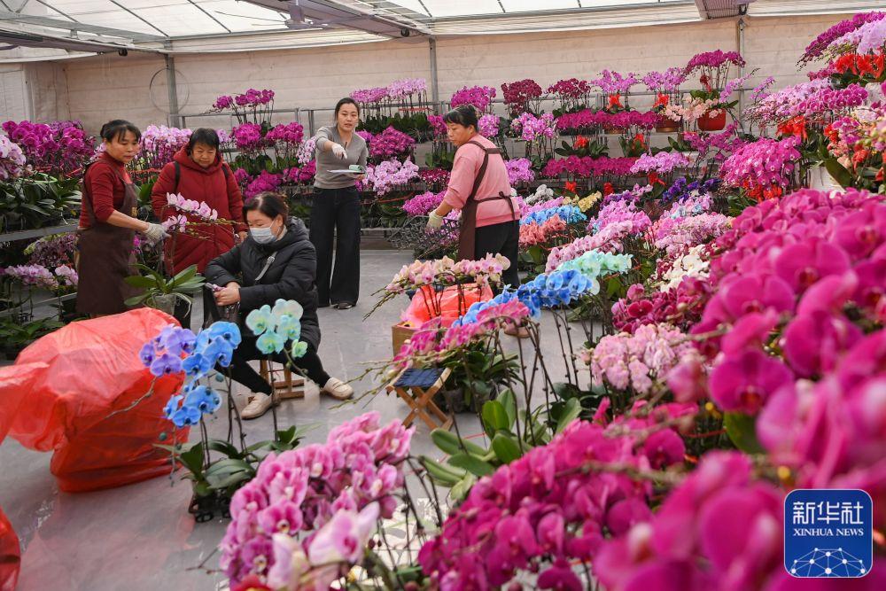 ↑1月23日,花卉工人在江苏省泰州市姜堰区顾高镇现代园艺产业园基地为花做造型,准备供应节日市场。新华社发(周社根摄)